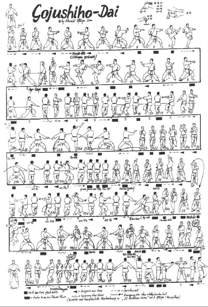Gojushiho Dai has a smaller frame than its twin, mostly due to its "trademark set" of kitsutsuki-no-kamae, keito-nagashi-uke, and otoshi-ippon-nukite. Essentially, the larger frame of the ryuun (flowing cloud) set of Gojushiho Sho is replaced by the smaller kitsutsuki (woodpecker) set of Gojushiho Dai. The grand style of ryuun-no-uke is replaced by the smaller curving keito-uke; the long shihon-tate-nukite are exchanged for shorter otoshi-ippon-nukite; and the big zenkutsu-dachi and kokutsu-dachi are traded for the much smaller neko-ashi-dachi. Gojushiho Dai has more techniques executed in neko-ashi-dachi than any other Shotokan kata. Along with Unsu, it is one of only two Shotokan kata that have no kokutsu-dachi at all (excluding Tekki, of course). This can prove difficult for Shotokan karateka who generally practice kokutsu-dachi to a much greater extent, often neglecting the practice of neko-ashi-dachi. One of the more difficult aspects of the kata occurs when changing direction from one neko-ashi-dachi to another; many students tend to have difficulty maintaining balance throughout.